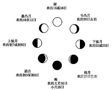 月相变化的周期——“朔望月”,并不等于恒星月,而比恒星月长些,等于29天12小时44分2.78秒。一个农历月的月相盈亏分别为:朔、眉月、上弦月、盈凸月、下弦月、残月、晦。