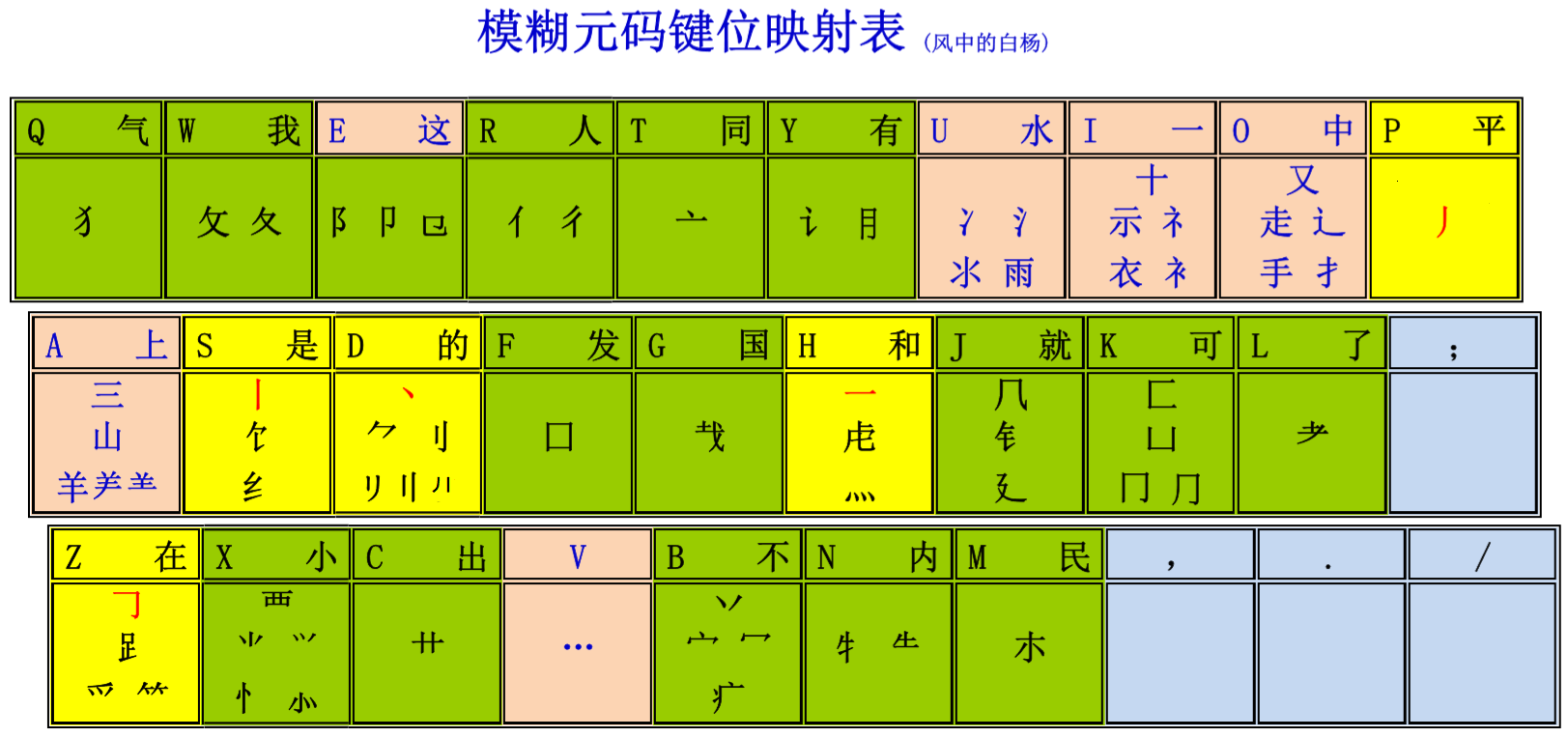 “v”键在元码中命名为模糊键。模糊键用于处理55部已定义部件外的剩余众多部件,这是元码输入法全名又叫模糊元码输入法的缘由。