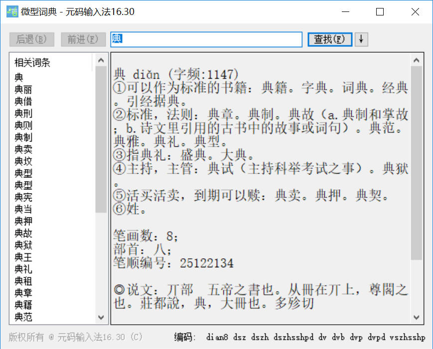 典王是元码输入法自带的一款微型词典,可以查询字、词、成语的编码、含义等内容。在输入候选状态,鼠标悬停在要查的字、词上面,会显示该字、词的解释,再单击下方的“查看详细解释…”就能打开词典了。